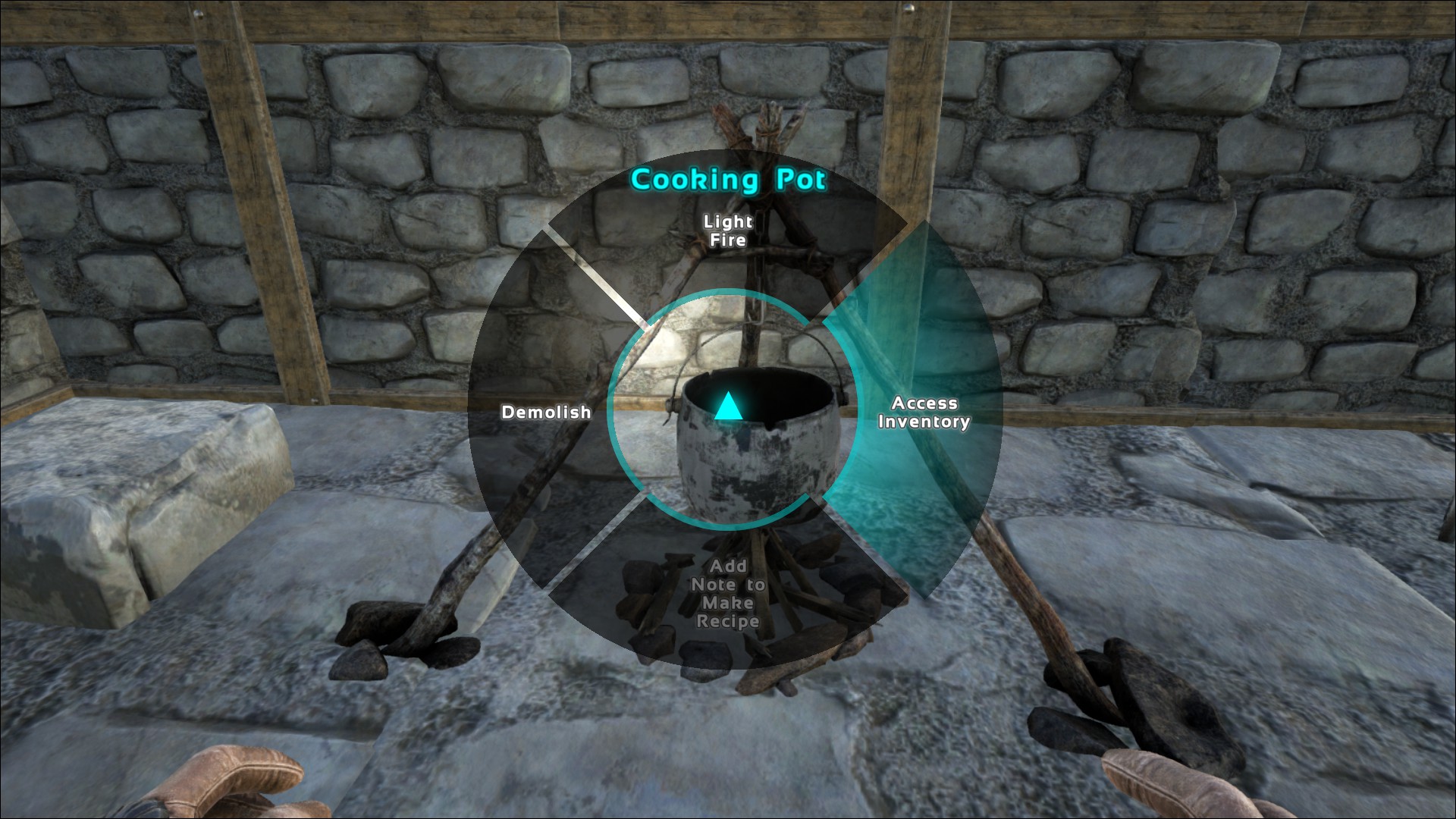 | Jetzt ruft Ihr über die Taste "E" das keisförmige Kochtopf - Menü auf und siehe da, der untere Reiter auf 6 Uhr, zeigt nun "Make Recipe" an, diesen wählt Ihr nun an. |