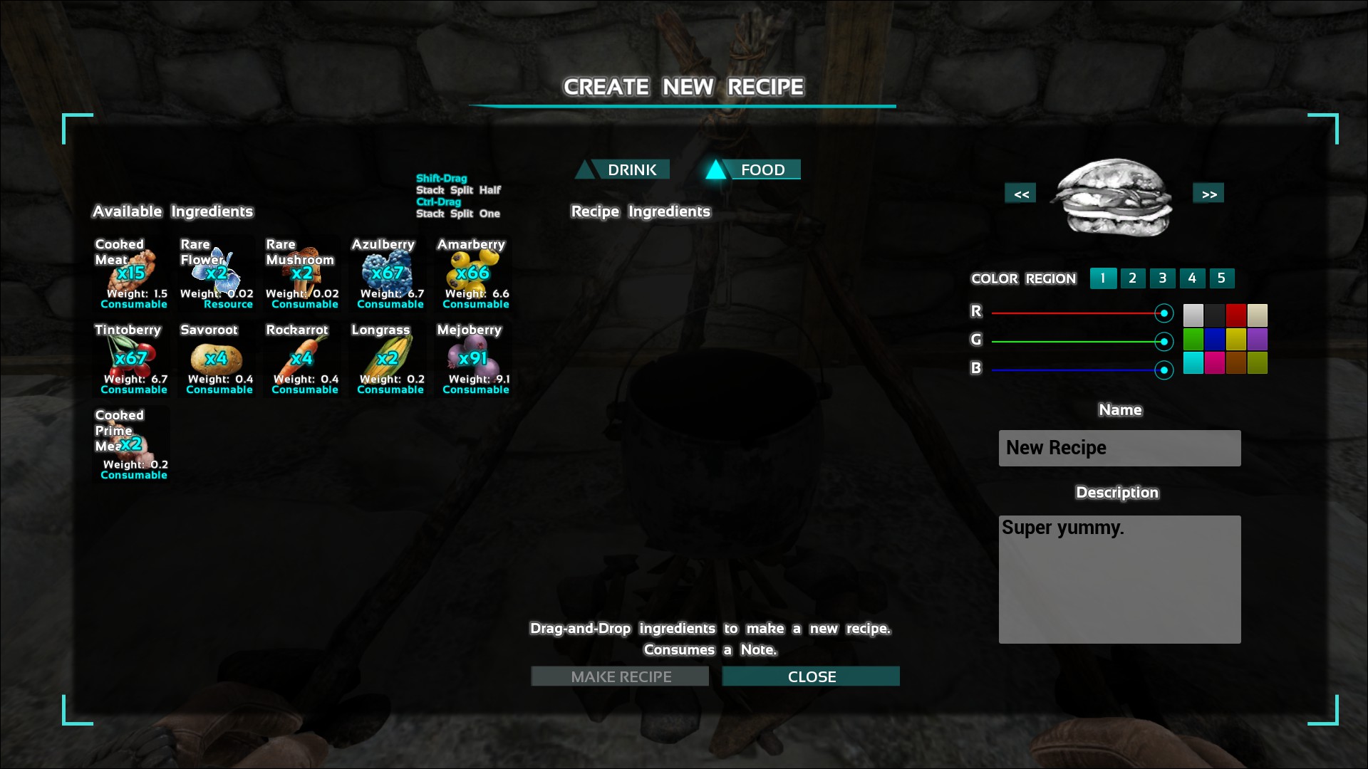 | Nachdem Ihr nun Euer Rezept benannt und gestaltet habt, werden die Zutaten entweder als Stapel per Mausin die Mitte des "Rezept Crafting Menüs" gezogen oder per gedrückter rechter "Shift - Taste" als 50% Stapel abgelegt. Auch kann man per gedrückter "STRG - Taste" einzelne Zutaten mittels Maus in die Mitte ziehen und ablegen. Abschließend bestätigen wir unser Rezept mit dem Button "Make Recipe" |