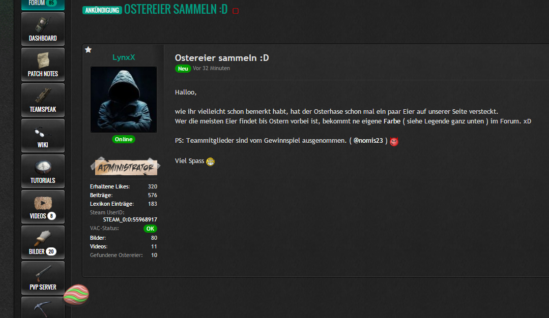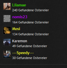 Wer die meisten Eier bis Ostern vorbei ist findet, bekommt ne eigene Farbe ( siehe Legende ganz unten ) im Forum. xD