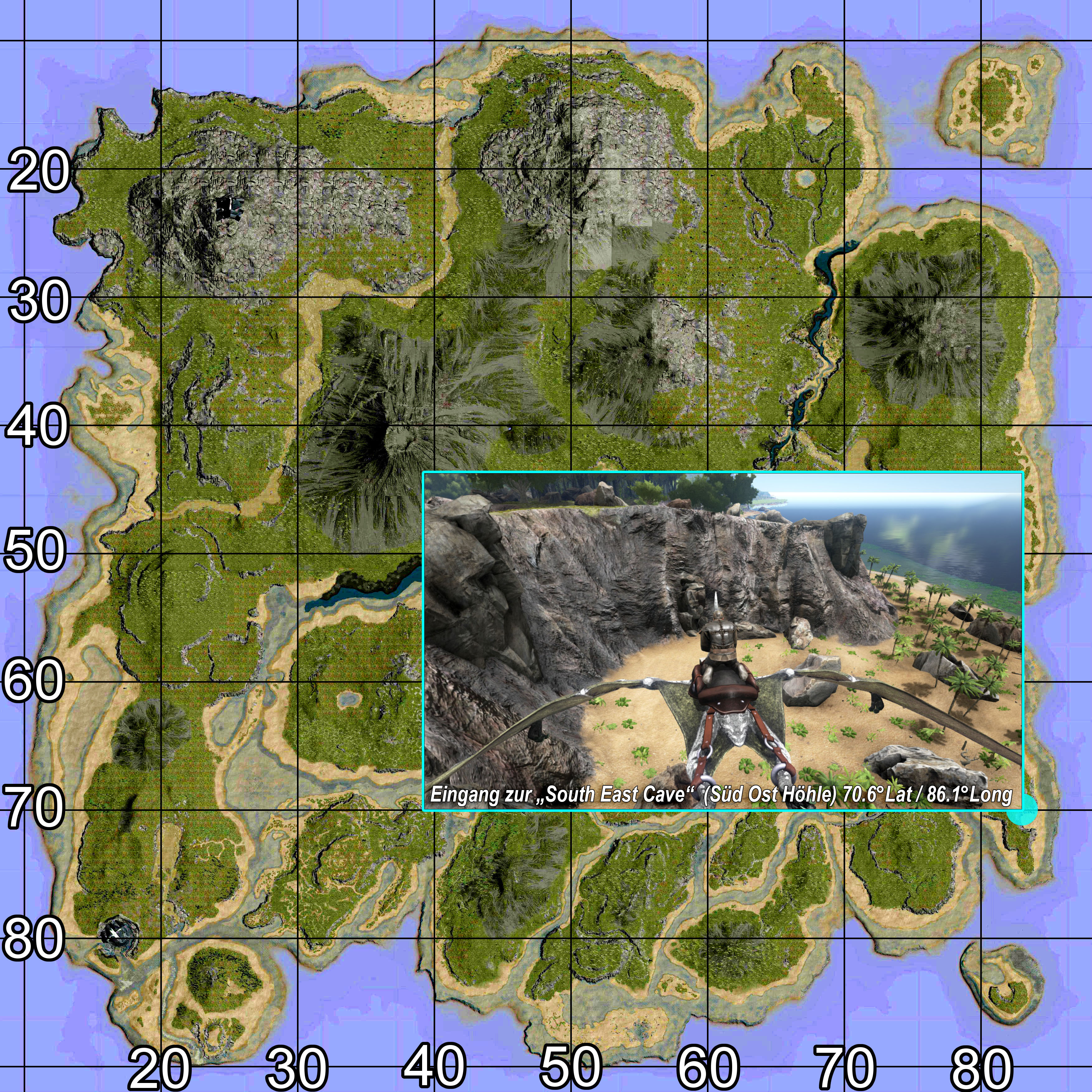 Die "Süd Ost Höhle" liegt sehr südlich an einem kleinem östlichen Landzipfel direkt am Ozean, die Koordinaten der Höhle lauten: 70.6 Lat / 86.1 Long. Die genaue Lage ist der Talkessel eines kleinen, fast kreisrunden Felsmassivs. Der Eingang der Höhle liegt darin in nördlicher Richtung. In dieser Höhle ist es sehr heiß und die Gegner treten in geballter Form auf, dadurch schätze ich die Schwierigkeit der "Süd Ost Höhle" mit mittel ein.