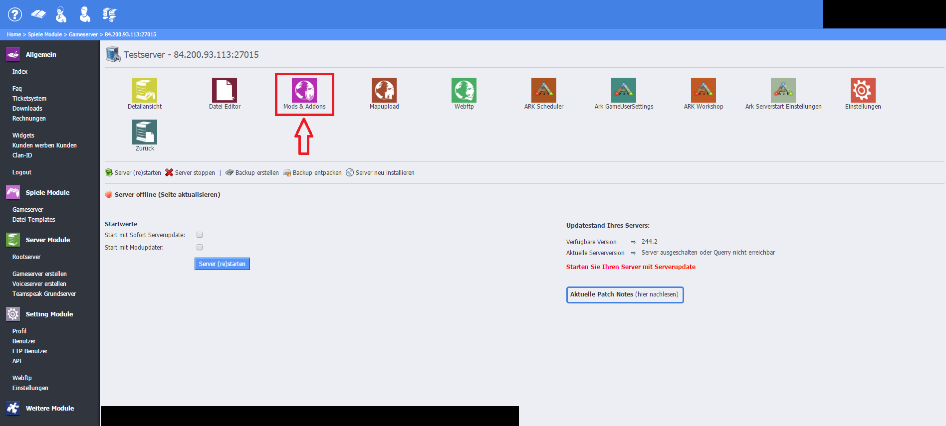 Schritt 6: Nach dem ihr den Server erfolgreich installiert habt, klickt ihr im Reiter auf "Mods & Addons"