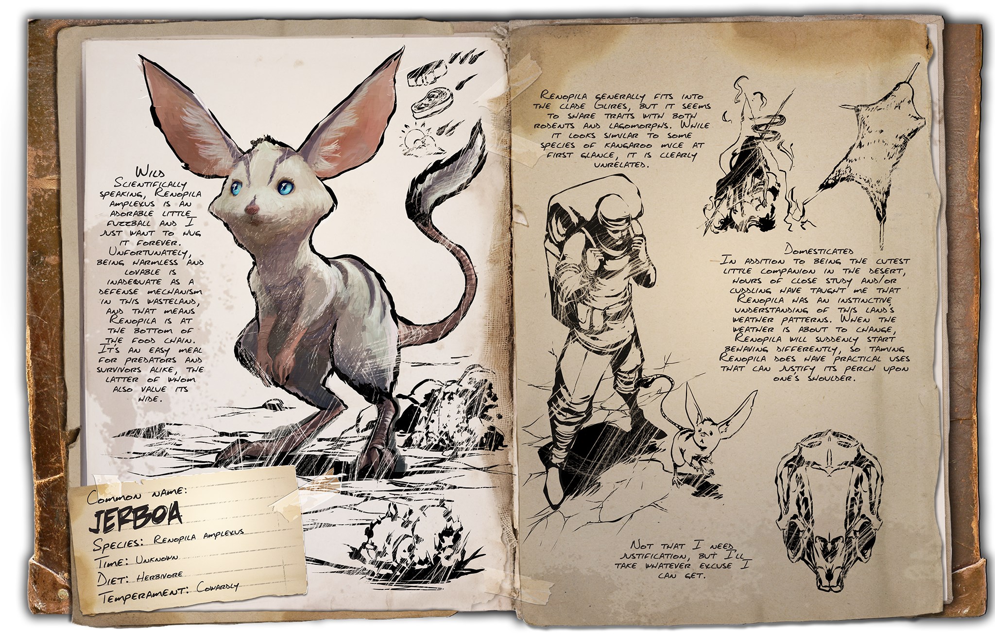 Der kleine Jerboa ist ein äußerst nützlicher Begleiter, er warnt vor Wetterumschwüngen und ist dadurch gerade für Admin Command / Cheat: Zähmbar: Ja Reitbar: Nein Dropt: |