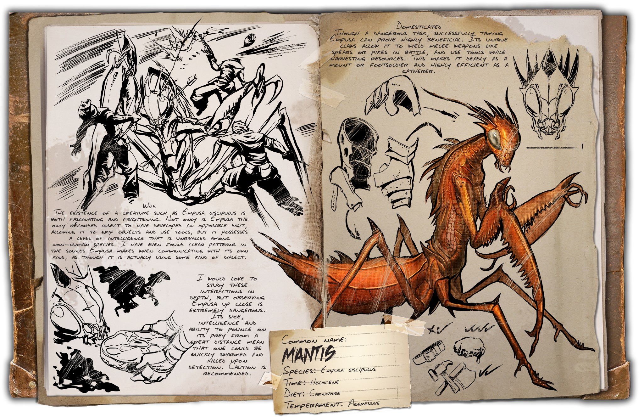Der Mantis ist ein aggressives Insekt, welches passiv gezähmt werden muß. Weiterhin hat er einen recht großen Wahrnehmungs - Radius Admin Command / Cheat: Zähmbar: Ja aber Passiv (Death Worm Spike) |