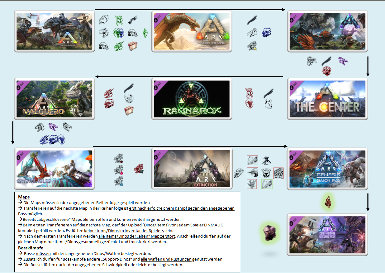 Mein langjähriger Ark-Kollege und ich (Wir sind M26 und M29) möchten mit Veröffentlichung des letzten DLC von ARK 1 einen kompletten Spieldurchgang mit allen 10 Maps spielen.
