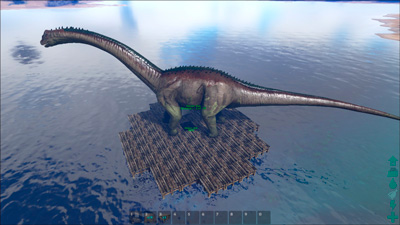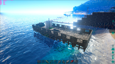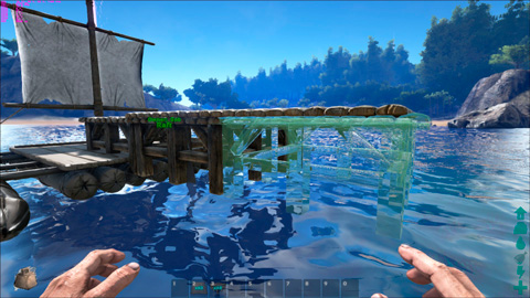 Da ich aber keinen schwimmenden Würfel, sondern ein Schiff haben möchte, bin ich auf einen Methode gestoßen, die es mir ermöglicht mit "wooden foundations" über die Grenzen des Flosses hinwegzubauen.