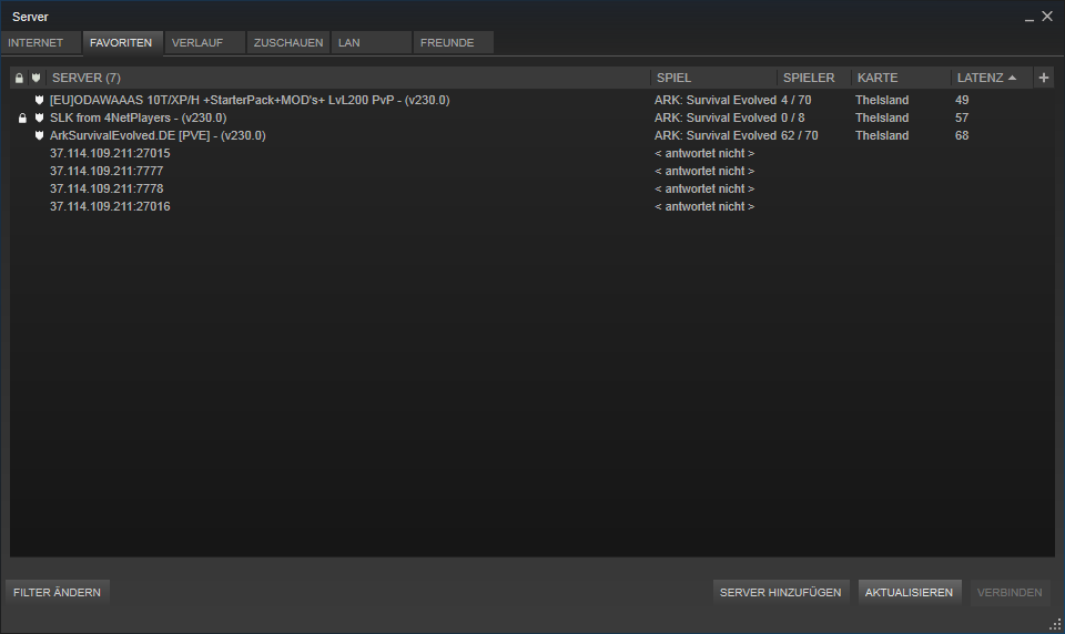 vlt. kann ja jemand helfen, der PVP Server 37.114.109.211:27015 antwortet nicht mehr seit dem Update auf 229 bzw. jetzt 230. Laut HP ist der online mit 22 Spielern. Der PVE Server 84.201.16.71:7777 antwortet brav und auch andere Server tun dies.