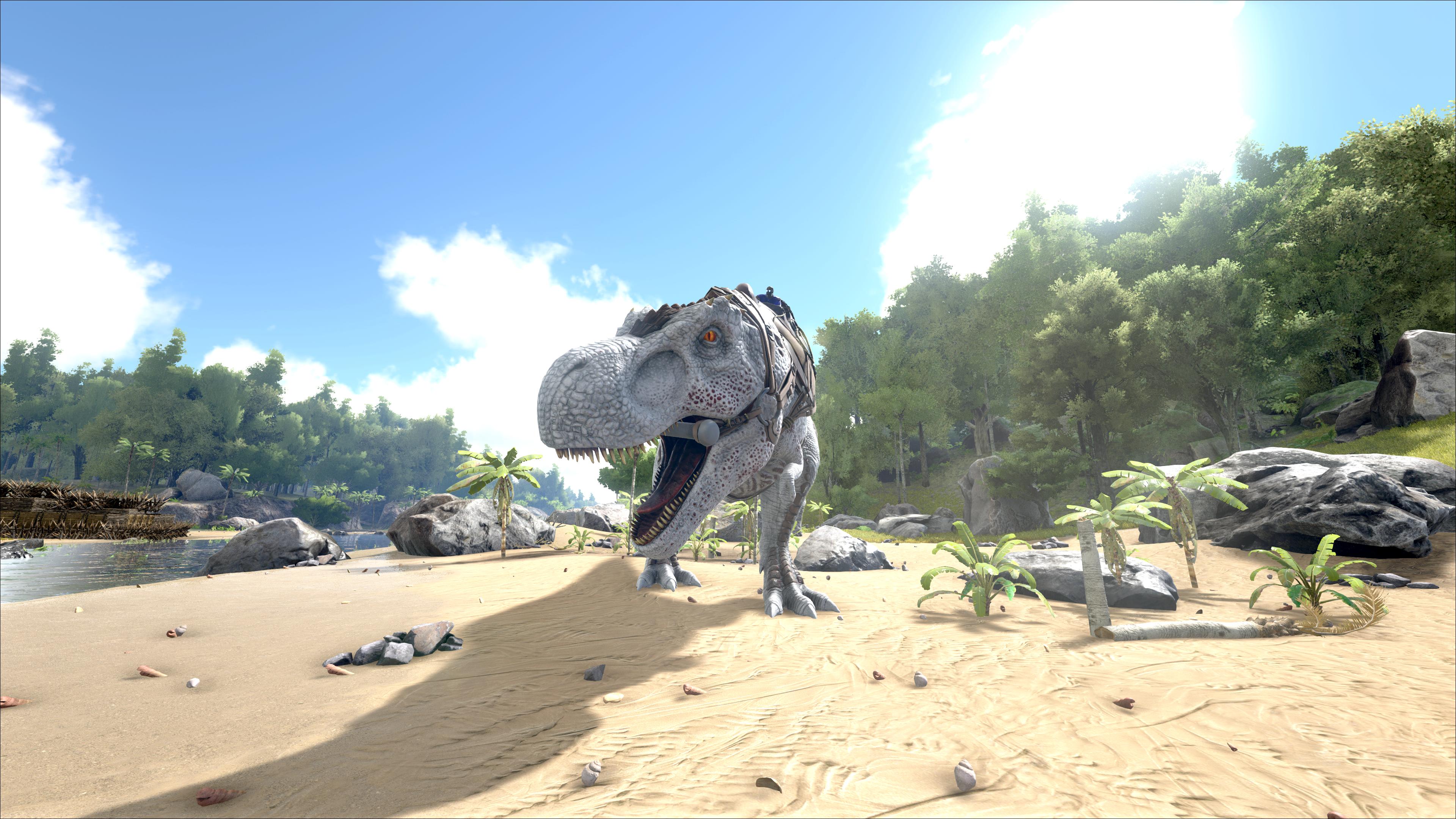 Eines Tages, als ich gerade im Haus mit den verschiedensten Dingen beschäftigt war, bebte bzw. wackelte alles! Erster Gedanke irgendetwas Großes scheint im Anmarsch zu sein. Und die Musik begann zu spielen, die signalisierte "hey, ich werde angegriffen". Darauf hin bin ich raus und plötzlich sah ich schon vor meinen Mauern einen weißen T-Rex lvl 150! Ich spielte mit den Gedanken, ob ich diesen versuchen sollte zu zähmen. Und dies startete ich letztendlich auch. Meine Betäubungspfeile wurden immer weniger und weniger. Wahnsinn - so ein T-Rex lvl 150 braucht schon einiges an Betäubung! Gott sei Dank habe ich vorgesorgt und jede Menge von diesen Betäubungspfeilen hergestellt. Der T-Rex versuchte währenddessen vergebens in meine Base zugelangen - Hoch Lebe meine Steinmauer. Wenn ich mich jetzt nicht irre habe ich um die 170 Pfeile in den T-Rex gejagt bis dieser sich endlich in das Träumeland verabschiedete! Jetzt heißts füttern. Zu Beginn gab ich ihm nur normales Fleisch zum Futtern und anschließend flog ich mit meinen Argentavis los und begab in eher gefährlicheres Gebiet. Dort hielt ich Ausschau nach Lebewesen, von denen man edles Fleisch (Prime Meat) bekommt. Vorteil ist, dass das Zähmen schneller geht und die Effektivität nimmt etwas zu! Nach dem ich 1 bzw. mehr Prime Meat gefarmt habe, ging es wieder zurück zu meinen großen Burschen. Dies musste immer alles sehr rasch erfolgen, da die Haltbarkeit von Prime Meat gering ist. Diesen Vorgang wiederholte ich mehrere Male und nach ca. 4 Stunden hatte ich endlich meinen T-Rex Albino lvl 198. Ich war direkt etwas stolz, dass ich sowas ganz alleine geschafft habe. Dies war auch so zusagen mein erster großer Erfolg in Ark Survival Evolved. Wollte dieses natürlich sofort reiten und bemerkte anschließend, dass ich noch keinen Sattel für einen Rex herstellen konnte. (Wenn ich mich nicht irre, kann man einen Rex Sattel mit lvl 74 herstellen). Ich schrieb eine Anfrage in den Chat. Die Anfrage war mehr oder weniger nur zum Spaß, rechnete also nicht mit einer Reaktion! Doch plötzlich Antwortete jemand, ich gab den Standort bekannt und schon kam jemand mit einen Quetzalcoatlus angeflogen und überreichte mir einen Rex Sattel.