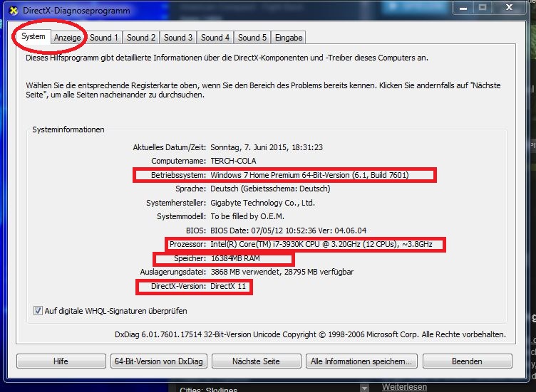 Unten links den Startknopf drücken und in der Suche dxdiag eingeben (Suche -> Leicht hellere schrift mit Programme/Datein durchsuchen)dann müsste ein Fenster aufgehen das so aussieht : Die eingekreisten sind von Nöten ;D (system und Anzeige)