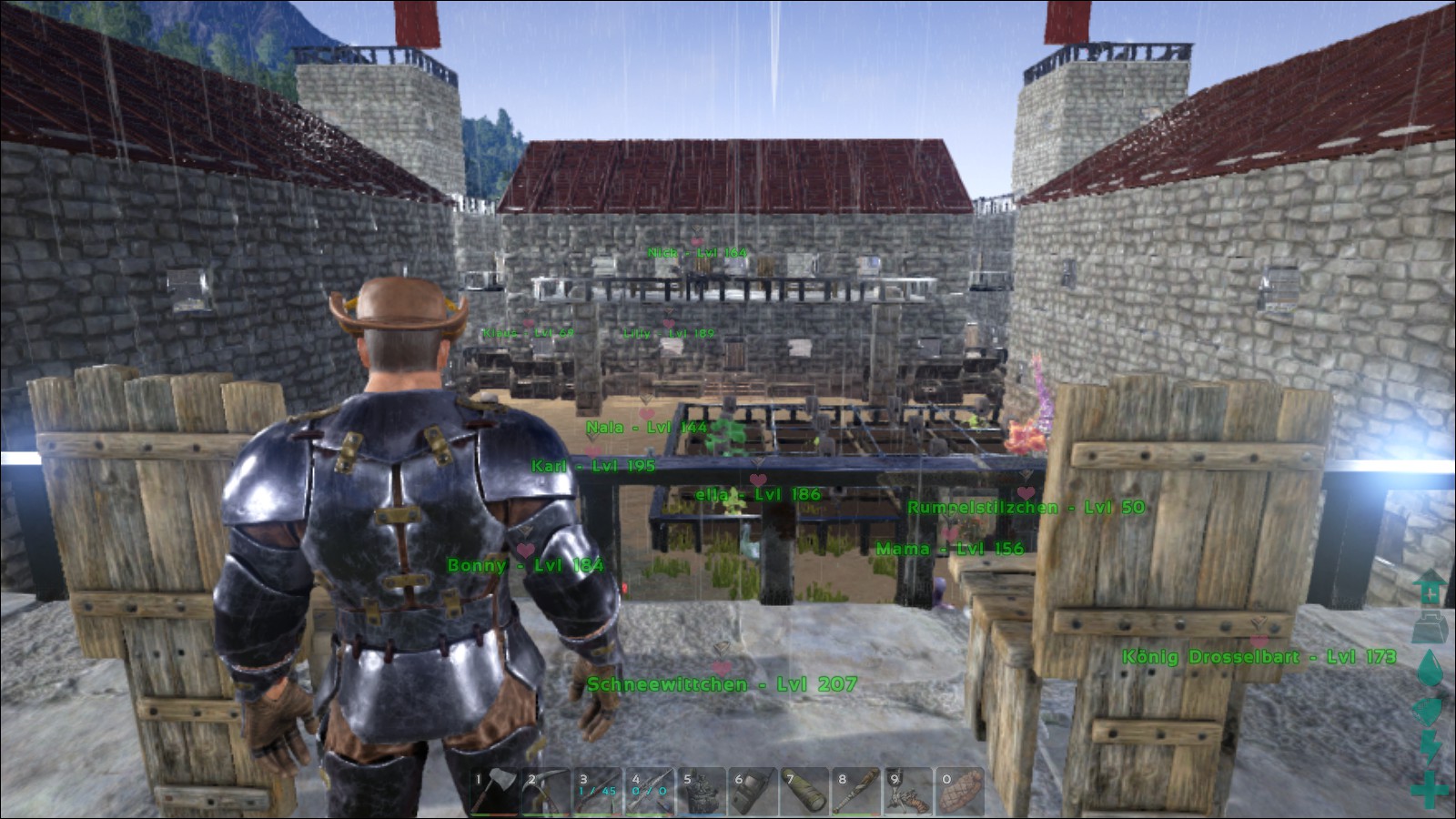 Balkon mit Sicht auf den Garten im inneren des Anwesen