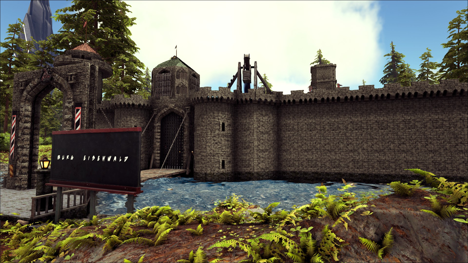 Haubteingang zur gesamten Burg. Zwei Zugbrücken überspannen einen Reissenden Fluss.