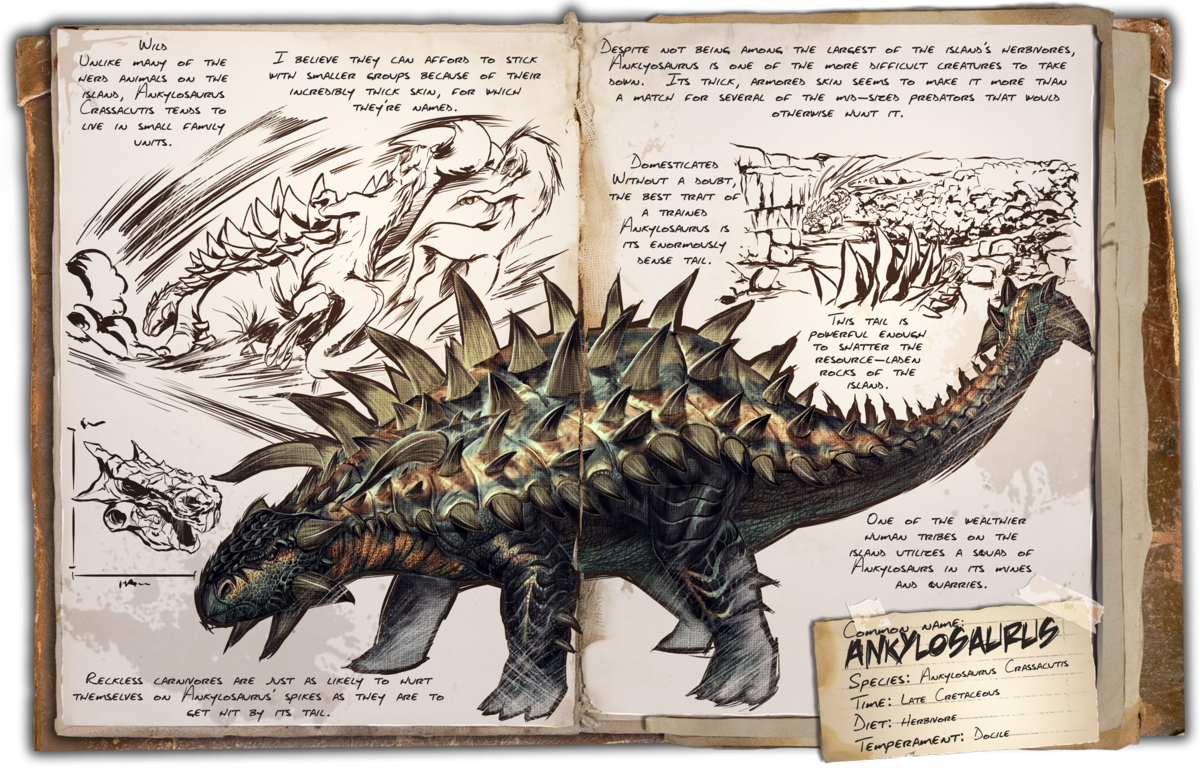 - Gezähmt: Das beste an einem trainierten Ankylosaurus ist ohne Zweifel seine enorm dichter fester Schwanz. Dieser Schwanz ist kraftvoll genug, um die "resource-laden rocks" der Insel zu zersplittern. Einer der reicheren Menschentribes der Insel benutzt ein Ankylosaurus-Squad in seinen Minen.