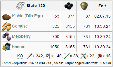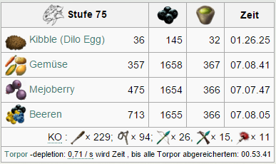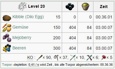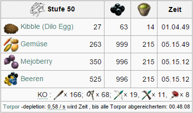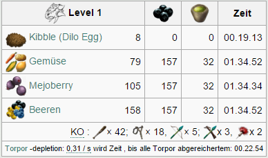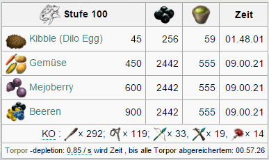 | Attribut | Menge auf Stufe 1 | Zuwachs pro Level (Wild) | Zuwachs pro Level (Gezähmt) | Taiming Bonus |