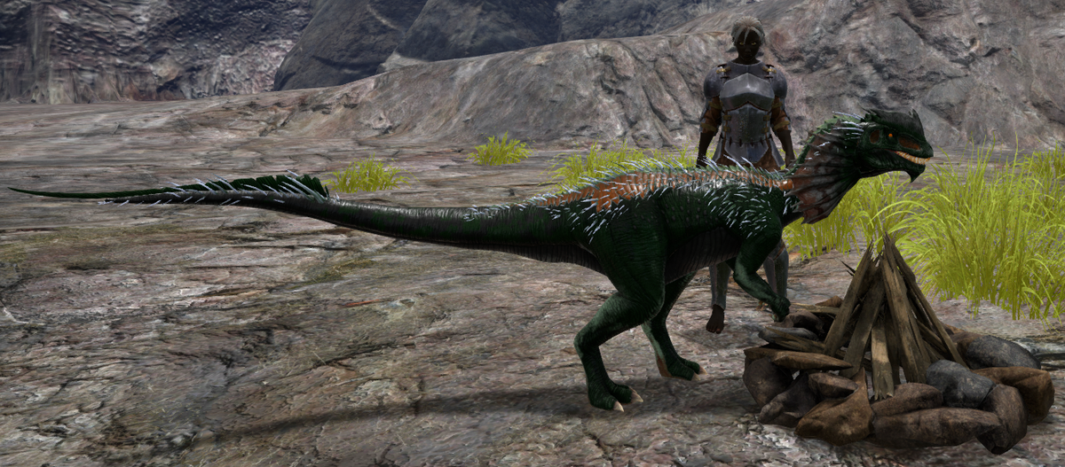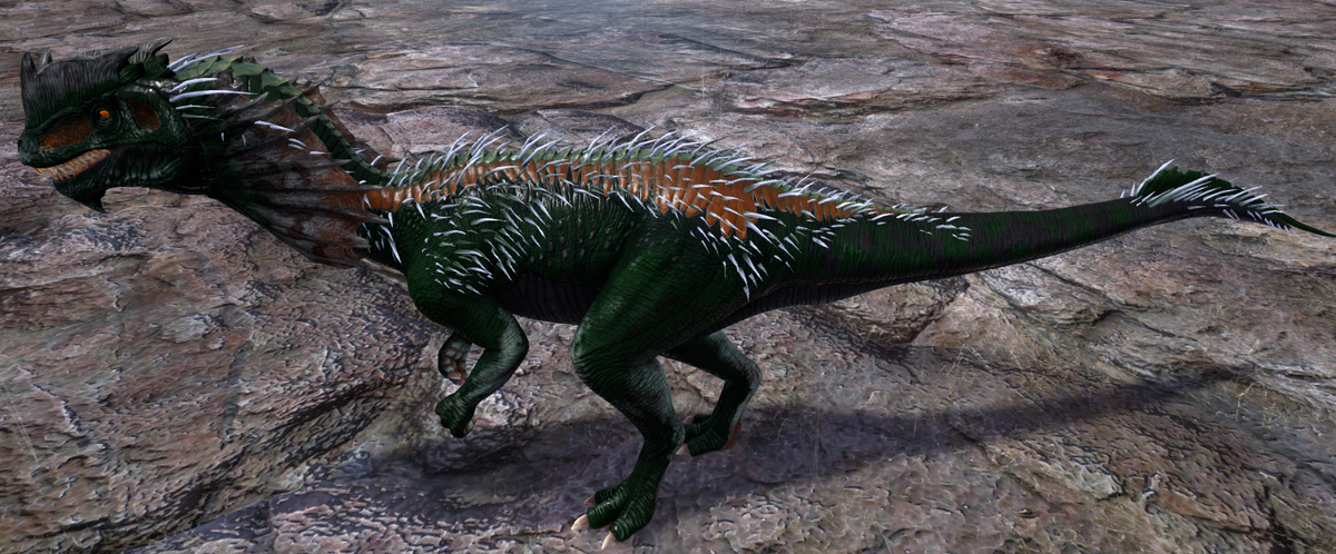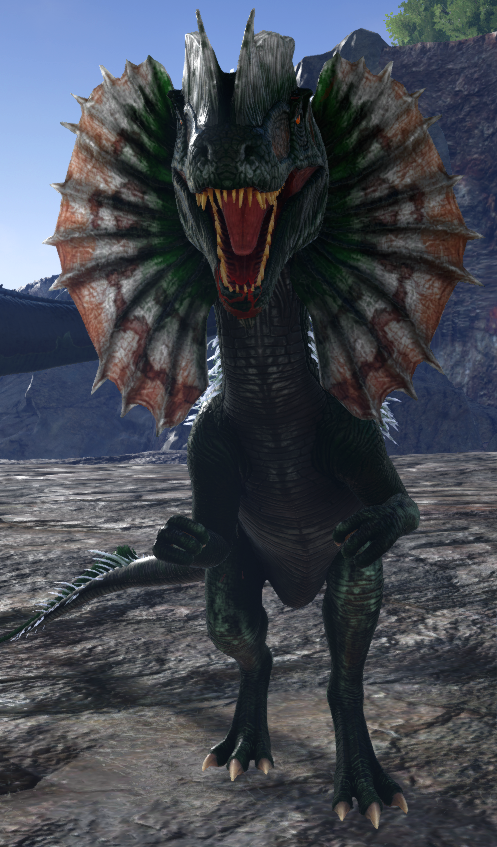 - Bekannte Informationen: Sollte man sich dem Dilophosaurus auf ein paar Schritte nähern, wird er angreifen. Provoziert man ihn, wird er sich mit seinem sichtraubenden Gift und tödlichen Bissen wehren. Des Weiteren greift er nur Dodos, Parasaurier und Pteranodons an. Dabei gelingt es ihm eigentlich nie, einen Pteranodon zu erlegen. Am liebsten frisst er bereits getötete Dinosaurier. Die ungewöhnlichste Fähigkeit das Dilophosaurus sputatrix ist es sein Gift in die Augen des Gegners zu spucken, dies soll den Gegner schwächen und paralysieren bevor er selbst zum Angriff übergeht. Außerdem besitzt er eine sehr schrille Stimme und eine dekorative Halskrause, man vermutet, dass er sich mit dieser Aufmerksamkeit bei anderen Artgenossen verschafft und um potentielle Beute oder Angreifer einzuschüchtern.