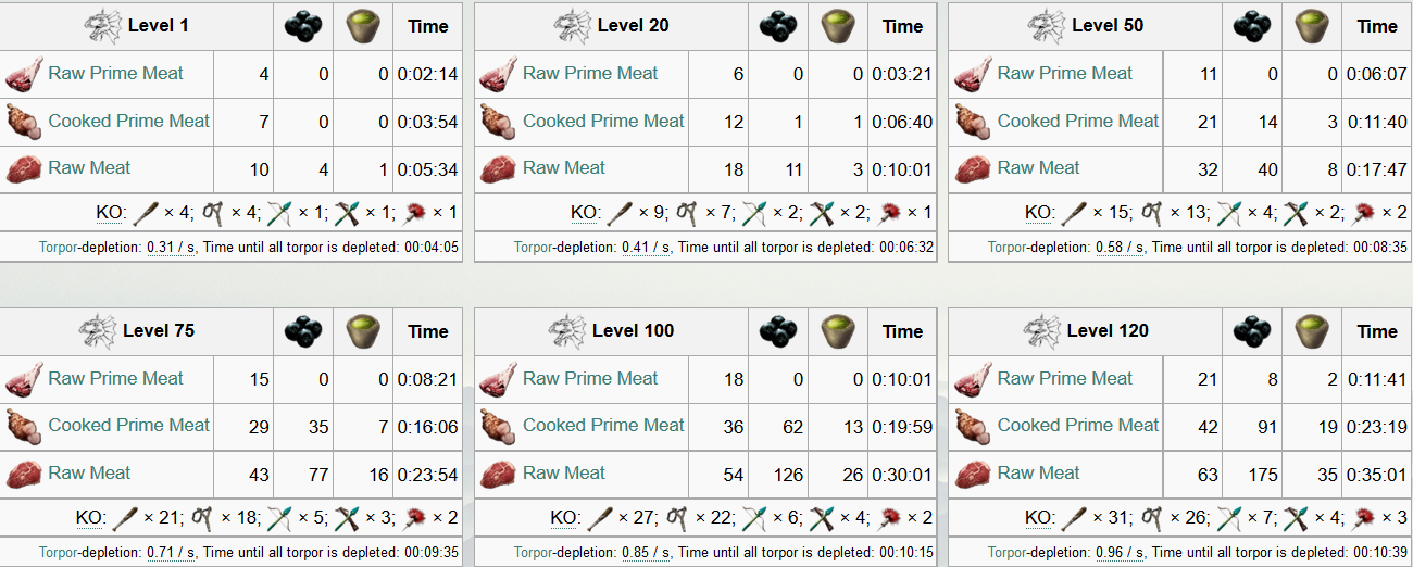 | Attribut | Menge auf Stufe 1 | Zuwachs pro Level (Wild) | Zuwachs pro Level (Gezähmt) | Taiming Bonus |