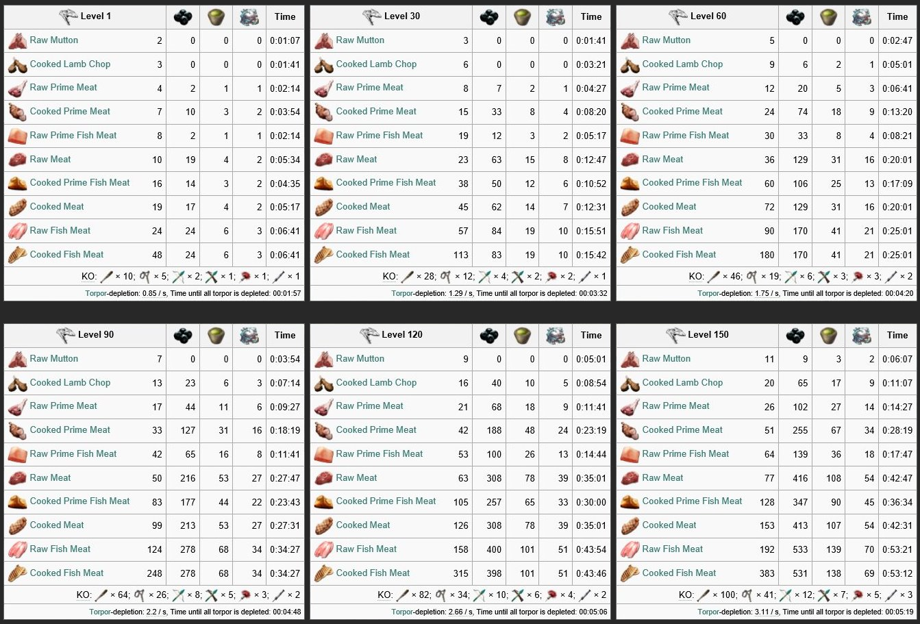 | Attribut | Menge auf Stufe 1 | Zuwachs pro Level (Wild) | Zuwachs pro Level (Gezähmt) | Taiming Bonus |