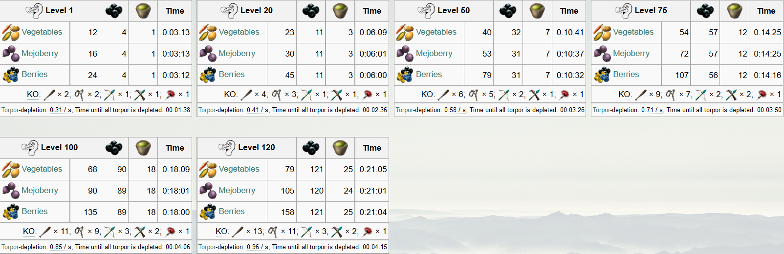 | Attribut | Menge auf Stufe 1 | Zuwachs pro Level (Wild) | Zuwachs pro Level (Gezähmt) | Taiming Bonus |