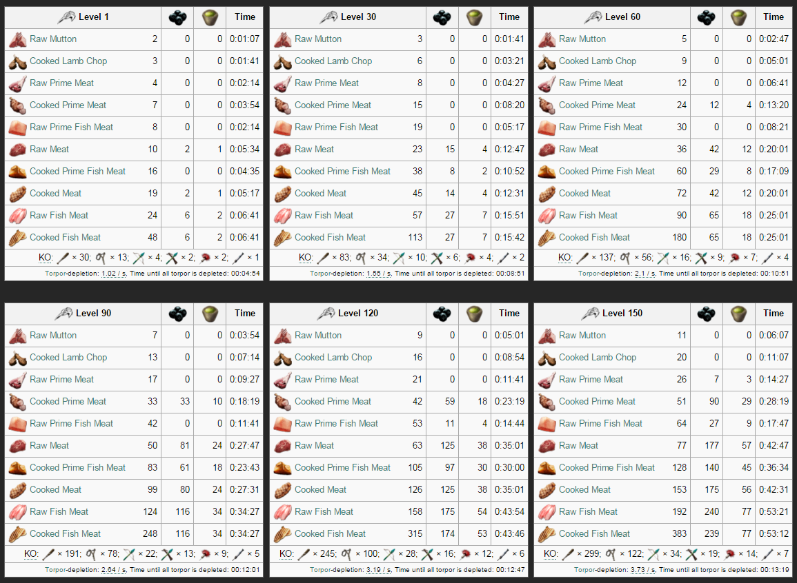 | Attribut | Menge auf Stufe 1 | Zuwachs pro Level (Wild) | Zuwachs pro Level (Gezähmt) | Taiming Bonus |