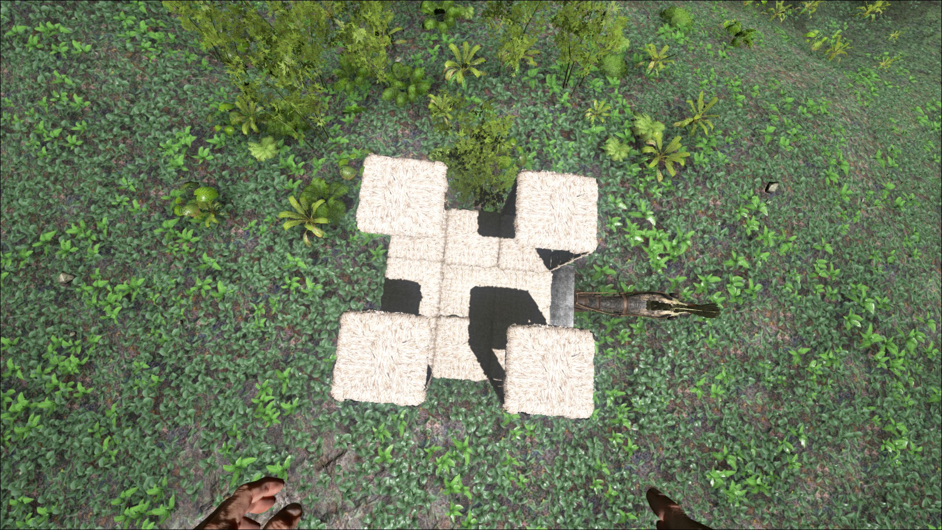 Baut auf die Quetzal Sattel Plattform und errichtet auf dieser eine 3 x 3 Fundamente / Deckenelemente große Grundfläche, jetzt baut Ihr jeweils pro Fundament 3 Türrahmen an der Außenseite (außer am Heck) in die Höhe, abschließend kommen oben jeweils in die Ecke jeweils ein Deckenelement.