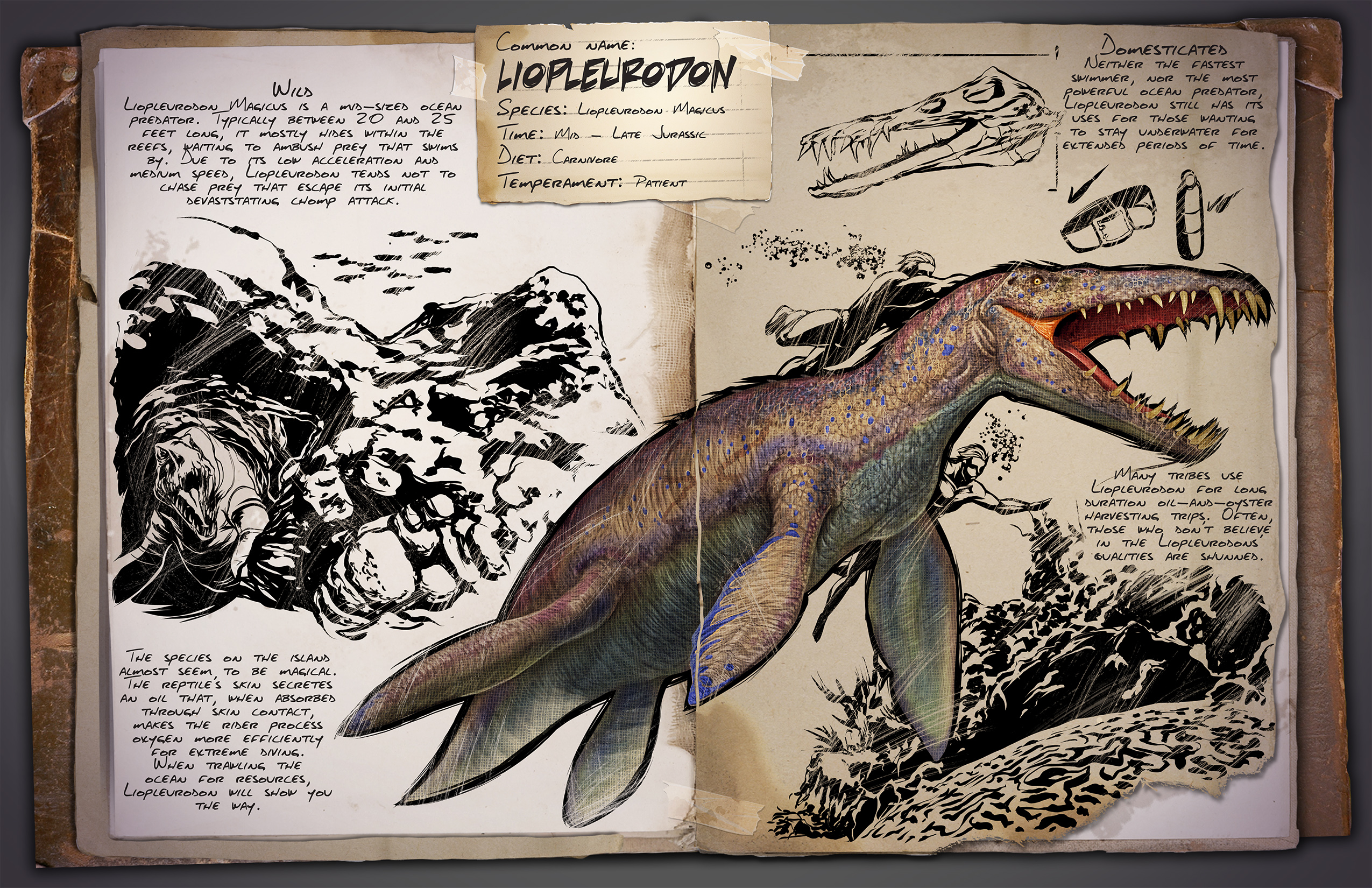 Manche Arten, auf der Insel, scheinen fast magisch zu sein. So sondert die Reptilienhaut des Liopleurodon eine ölartige Substanz ab, diese wird über die Haut des Reiters aufgenommen und ermöglicht ihm einen weitaus effizienteren Sauerstoffhaushalt. Solltest Du mit dem Liopleurodon auf Ressourcen Suche sein, lass Dir von Ihm, den Weg dahin durch den Ozean, zeigen.