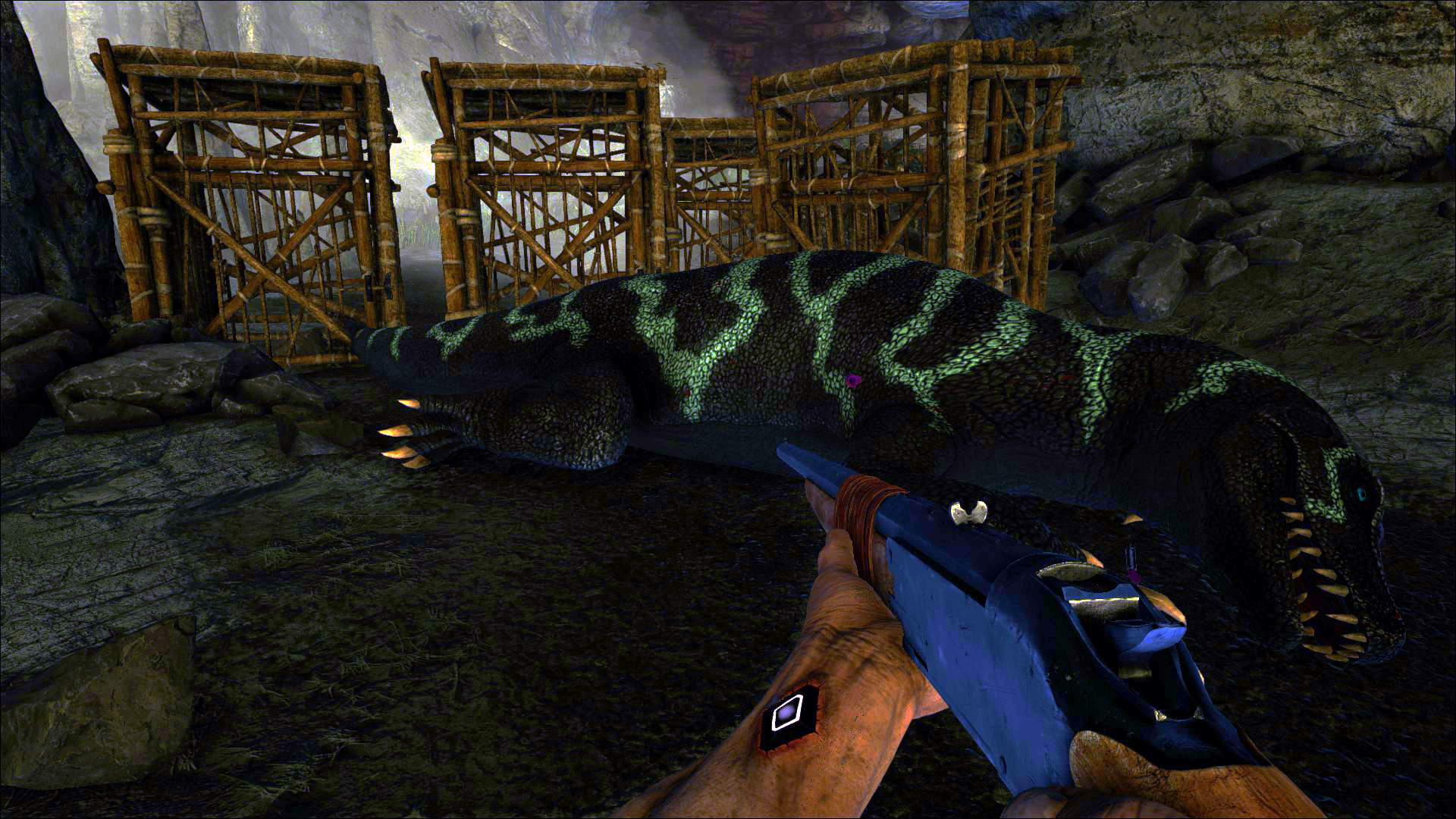 Jetzt solltet Ihr Megalania die Fluchtwege versperren, das geht am besten mit dem Holzkäfig, platziert diese so, das er nicht hindurch passt.