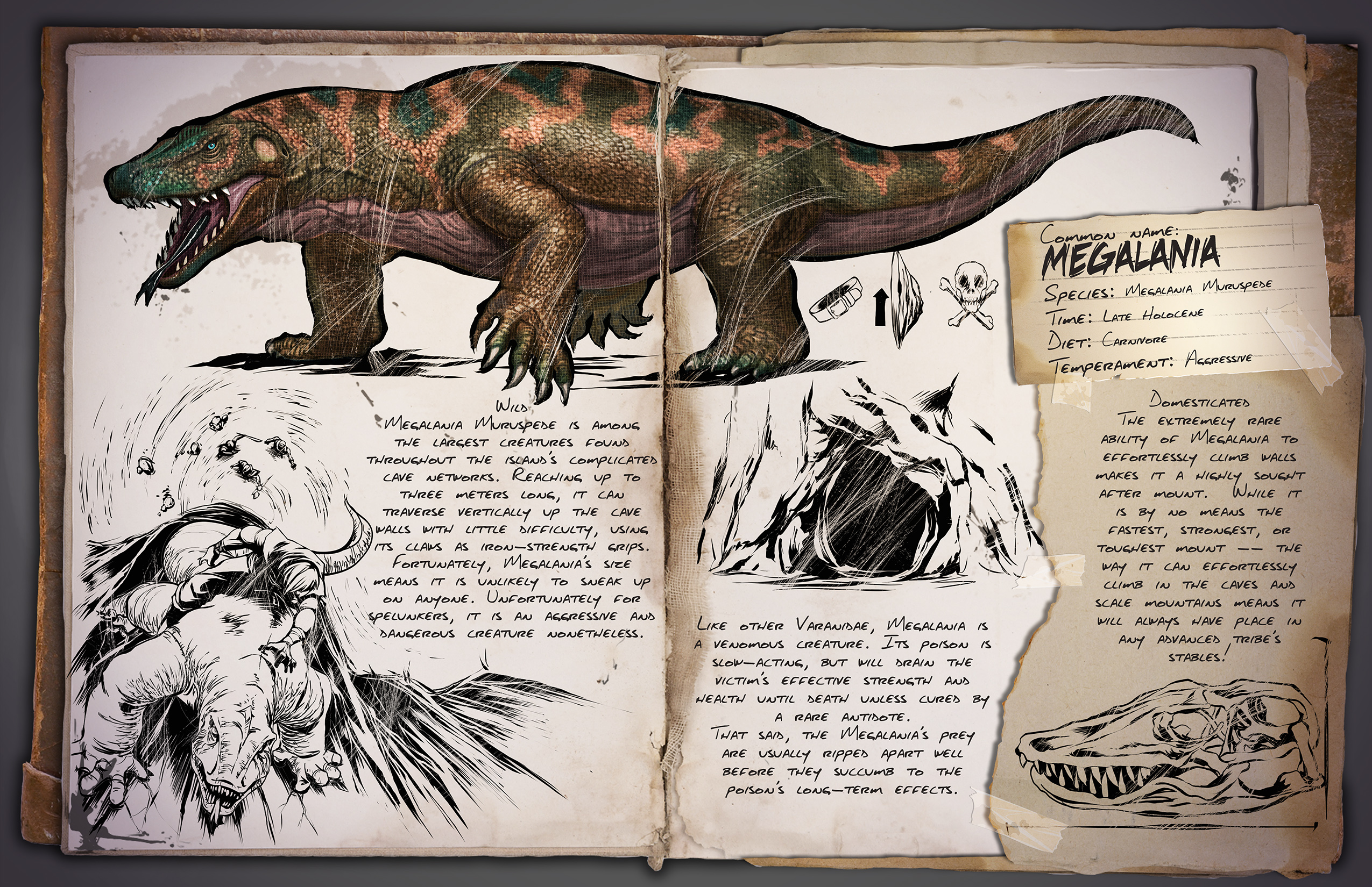 Megalania verbreitet Tollwut, eine Krankheit die er mittels Biss überträgt diese nimmt Euch Leben und Ausdauer, kann geheilt werden durch den Verzehr von Kleines Heilserum.
