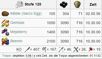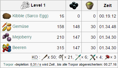 Attribut Menge auf Stufe 1 Zuwachs pro Level (Wild) Zuwachs pro Level (Gezähmt) Taming Bonus