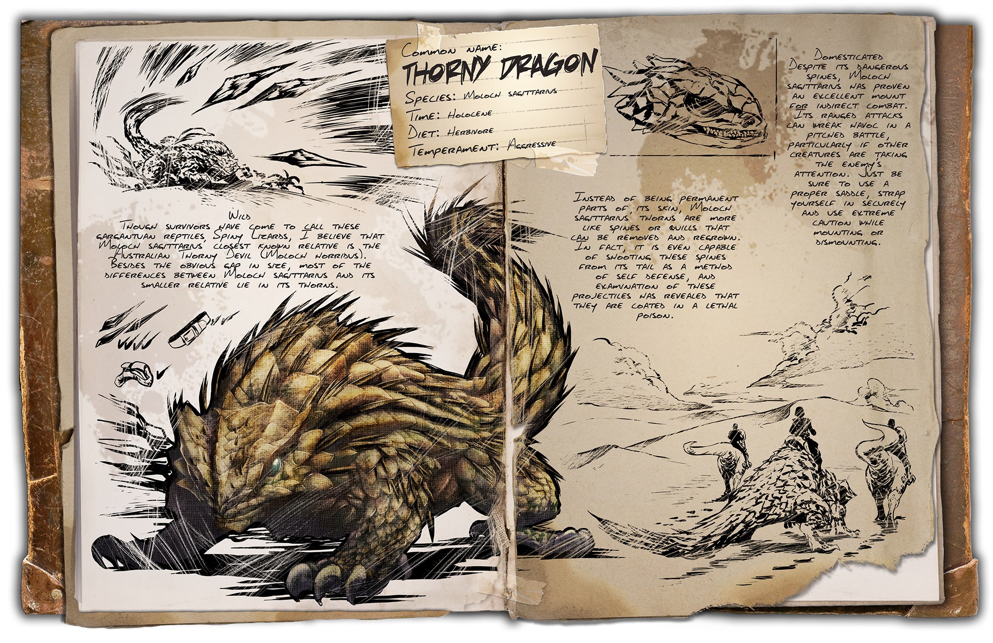 Sehr viele Überlebende nennen dieses gewaltige Reptil Stachel Echse, dennoch ist Moloch sagittarius nächster Verwandter der in Australien heimische Dornteufel. Nicht nur der Größenunterschied ist beachtlich, sondern der markanteste Gegensatz zum Dornteufel sind seine dornigen Stacheln. -