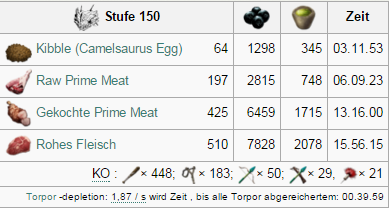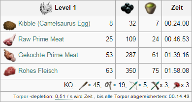 | Attribut | Menge auf Stufe 1 | Zuwachs pro Level (Wild) | Zuwachs pro Level (Gezähmt) | Taming Bonus |
