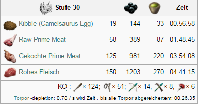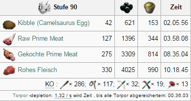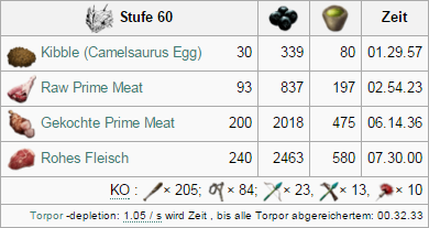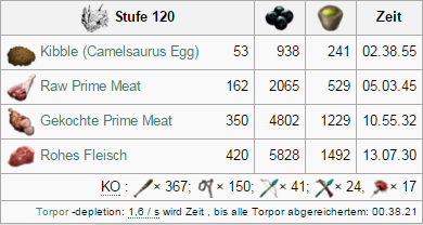| Attribut | Menge auf Stufe 1 | Zuwachs pro Level (Wild) | Zuwachs pro Level (Gezähmt) | Taming Bonus |