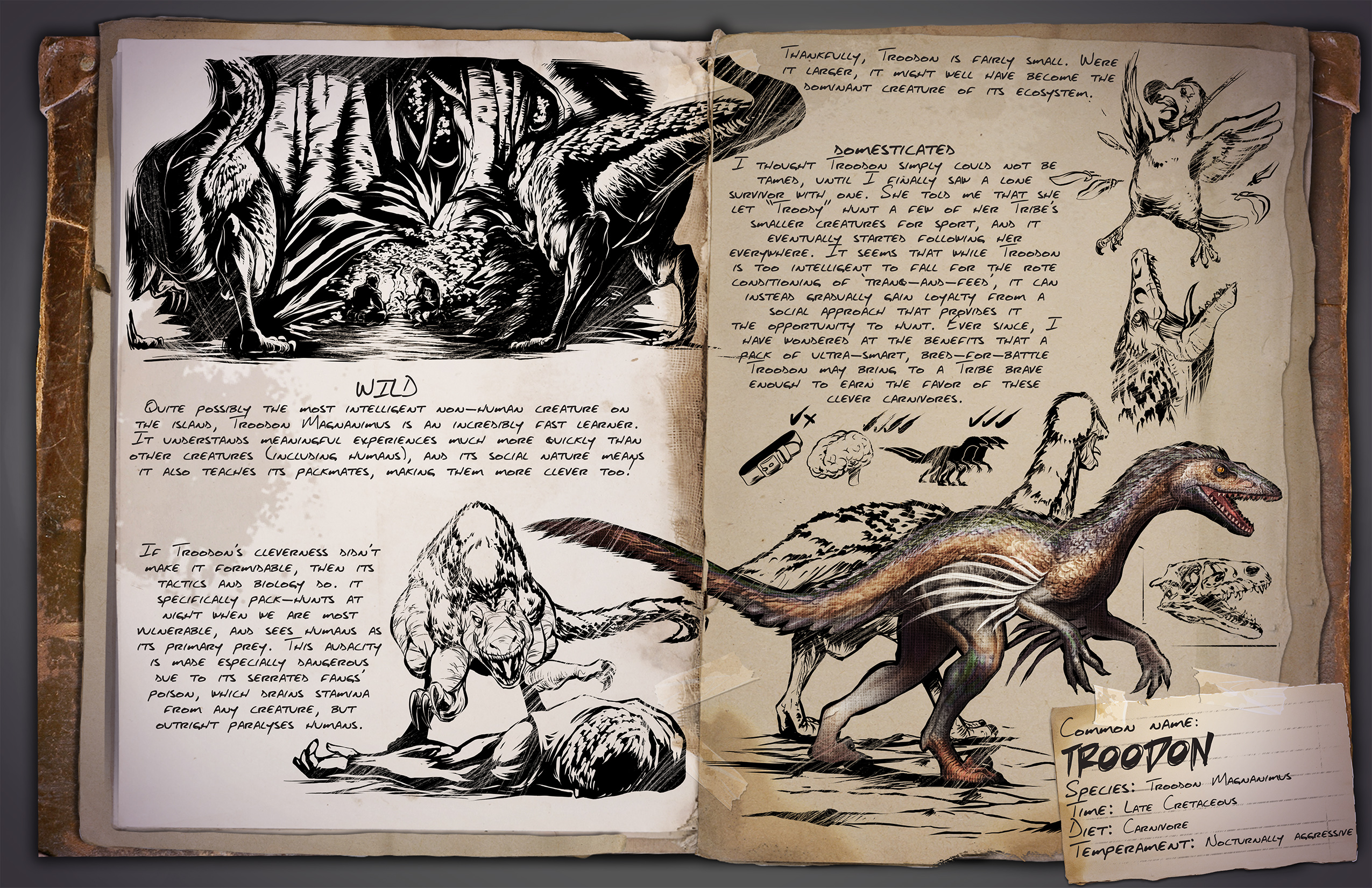 Anfänglich nahm ich an, dass der Troodon nicht gezähmt werden kann, doch dann sah ich eine Überlebende welche ein Troodon besitzt. Sie erzählte mir, das „Troody“ sich wohl aus sportlichen Gründen ihrer Jagd auf kleinere Tiere mit anschloss und ab einem gewissen Zeitpunkt, folgte er ihr überall mit hin. Tatsächlich scheint es so, als wäre ein Troodon zu schlau für die Methode des „betäuben & füttern“ um ihn für sich zu gewinnen. Seine Loyalität erreicht man durch eine soziale Interaktion, welche ihm die Möglichkeit zu Jagd gibt. Seitdem mache ich mir Gedanken darüber, welche Vorteile es dem Stamm bringt, ein Rudel dieser aufwendig zu zähmenden Fleischfresser zu besitzen. -