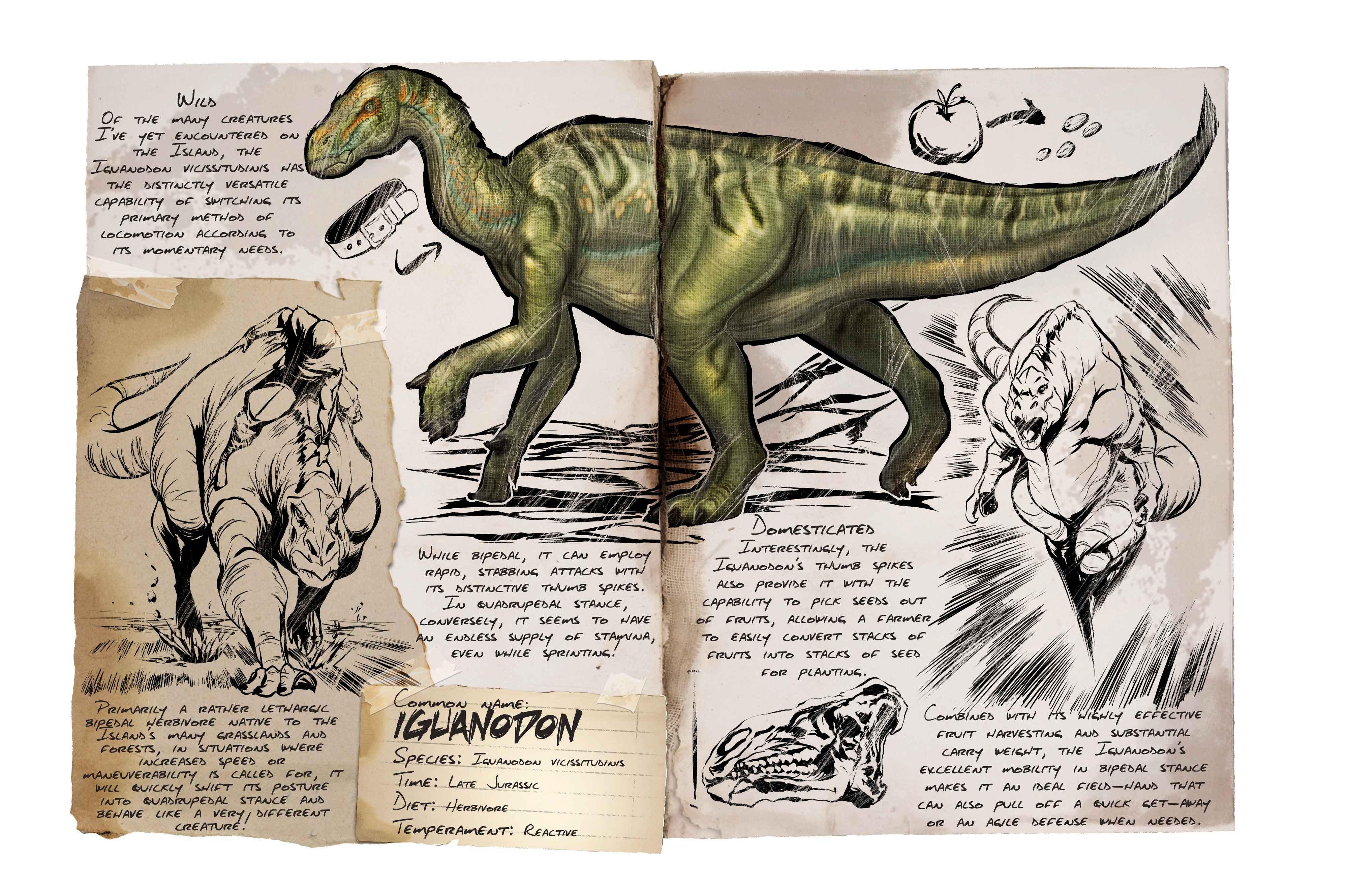 Von den vielen Tieren, welche ich bis jetzt auf der Insel angetroffen habe, besitzt der Iguanodon vicissitudinis einige bemerkenswerte Attribute. Es ist die Art seiner Fortbewegung und wie er diese je nach Situation schnell anpasst. Auf zwei Beinen stehend, kann er durchdringende Angriffe mit seinen spitzen Daumenklauen ausführen. Stehend auf allen vieren besitzt er einen geradezu unendlichen Vorrat an Ausdauer, auch wenn er rennt. -