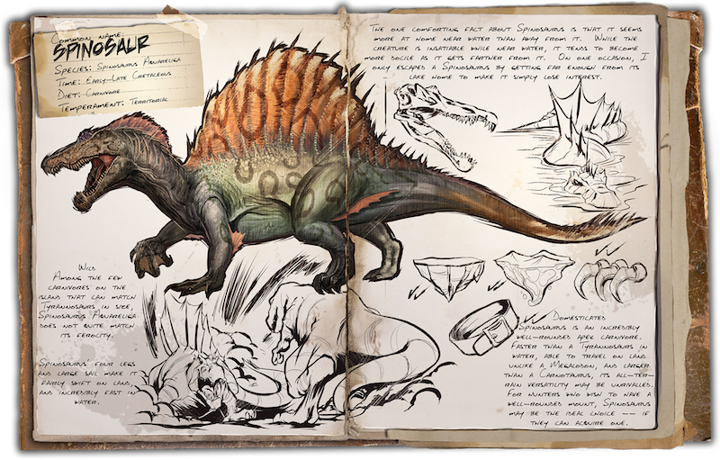 - Gezähmt: Der Spino ist ein sehr gefährlicher Fleischfresser. Schneller als ein T-Rex im Wasser, im Gegensatz zu einem Megalodon in der Lage an Land zu reisen und größer als ein Carnotaurus, ist er in seiner Flexibilität unerreicht. Für Jäger die ein vielseitiges und gefährliches Reittier haben möchten, kann der Spinosaurus die optimale Wahl sein. Wenn sie es denn schaffen, einen zu zähmen.